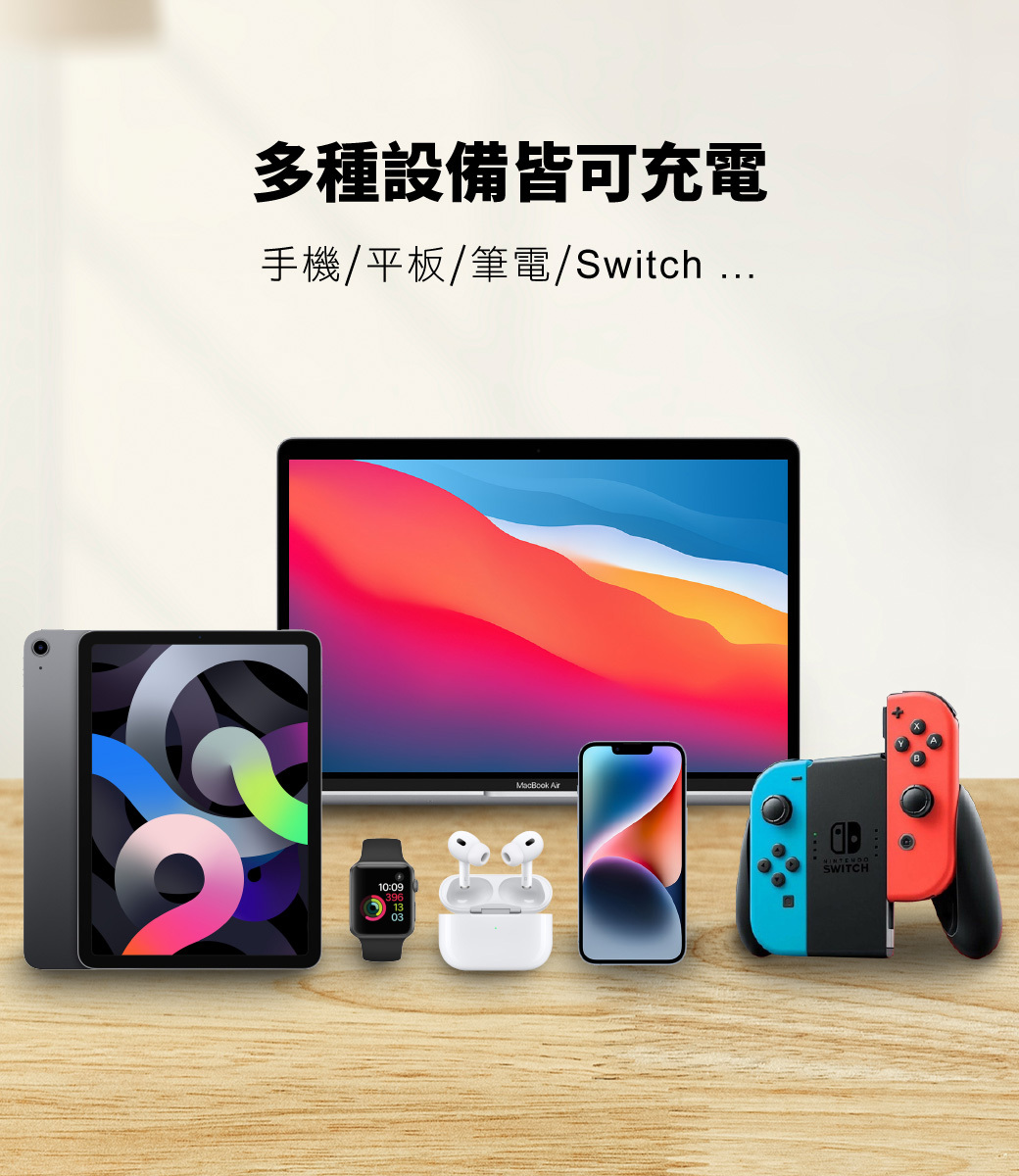 .因應各式裝置充電需求,手機、平板、Switch 等行動裝置