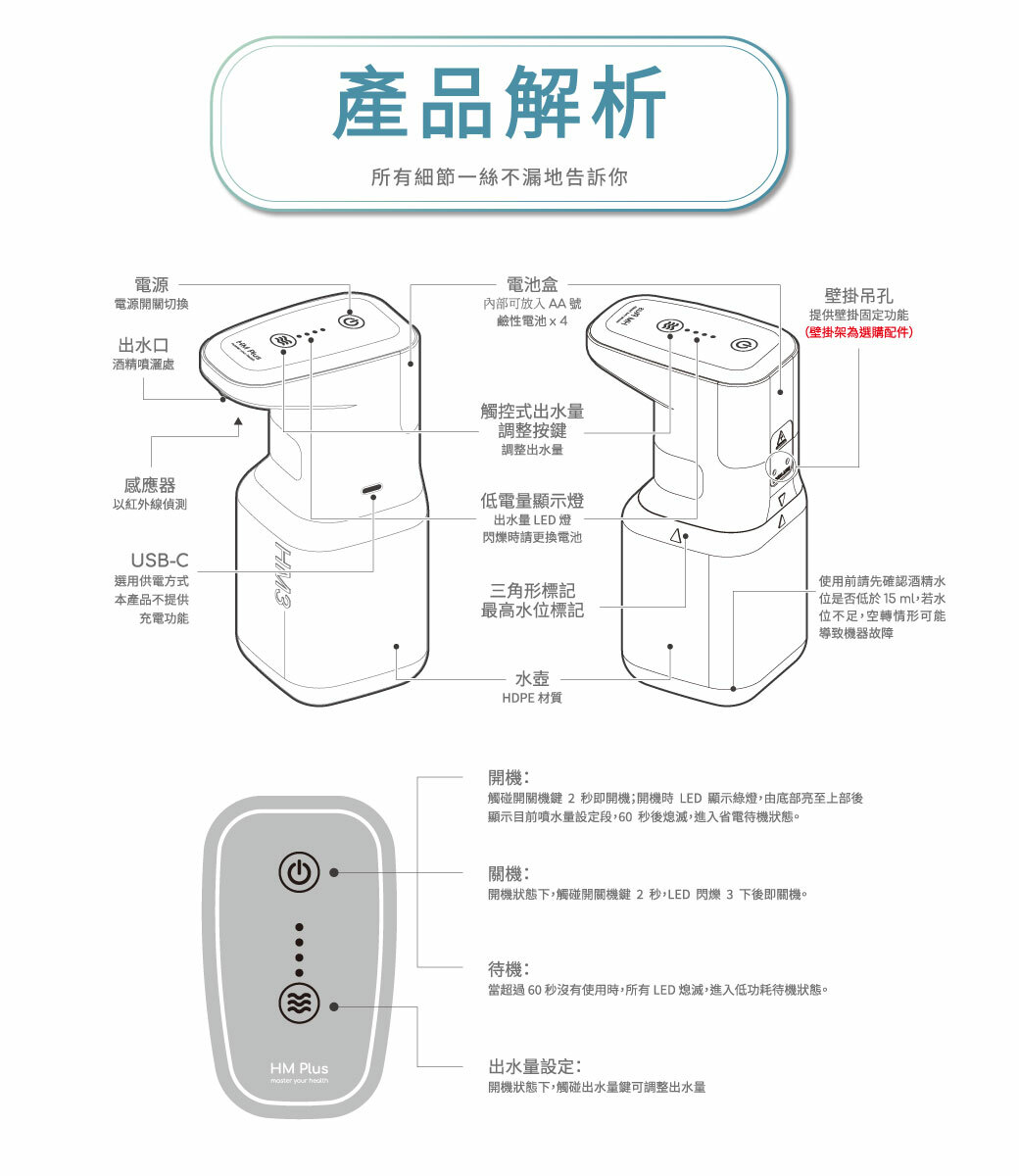 內容物:自動手指消毒器 x 1、AA 鹼性電池 x 4
