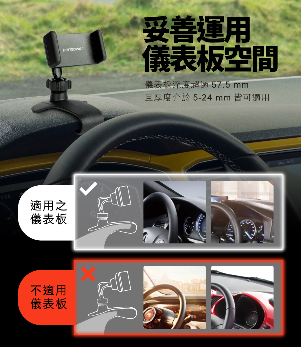 .儀表板深度超過 57.5 mm,且厚度介於 5-24 mm 皆可適用