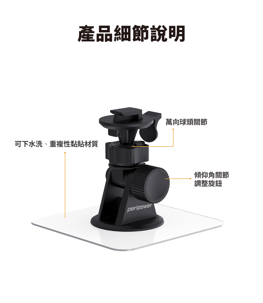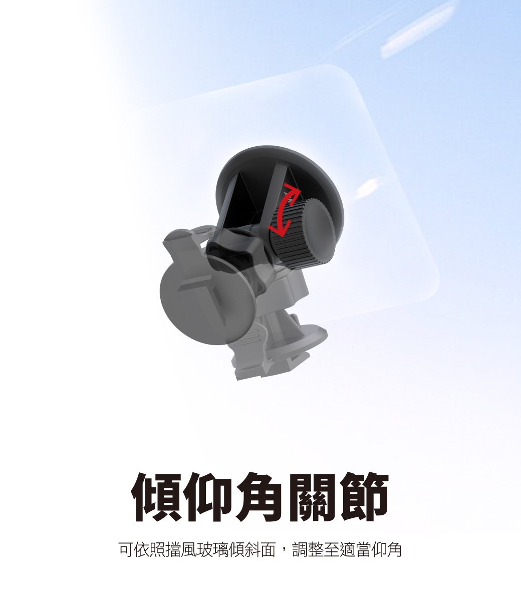 .傾仰角關節,可依照擋風玻璃傾斜面,調整至適當仰角