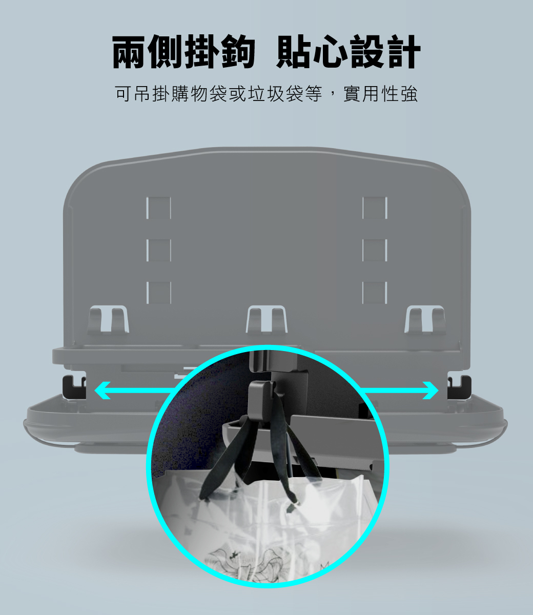 .餐盤架兩側掛鉤設計,可吊掛購物袋或垃圾袋等
