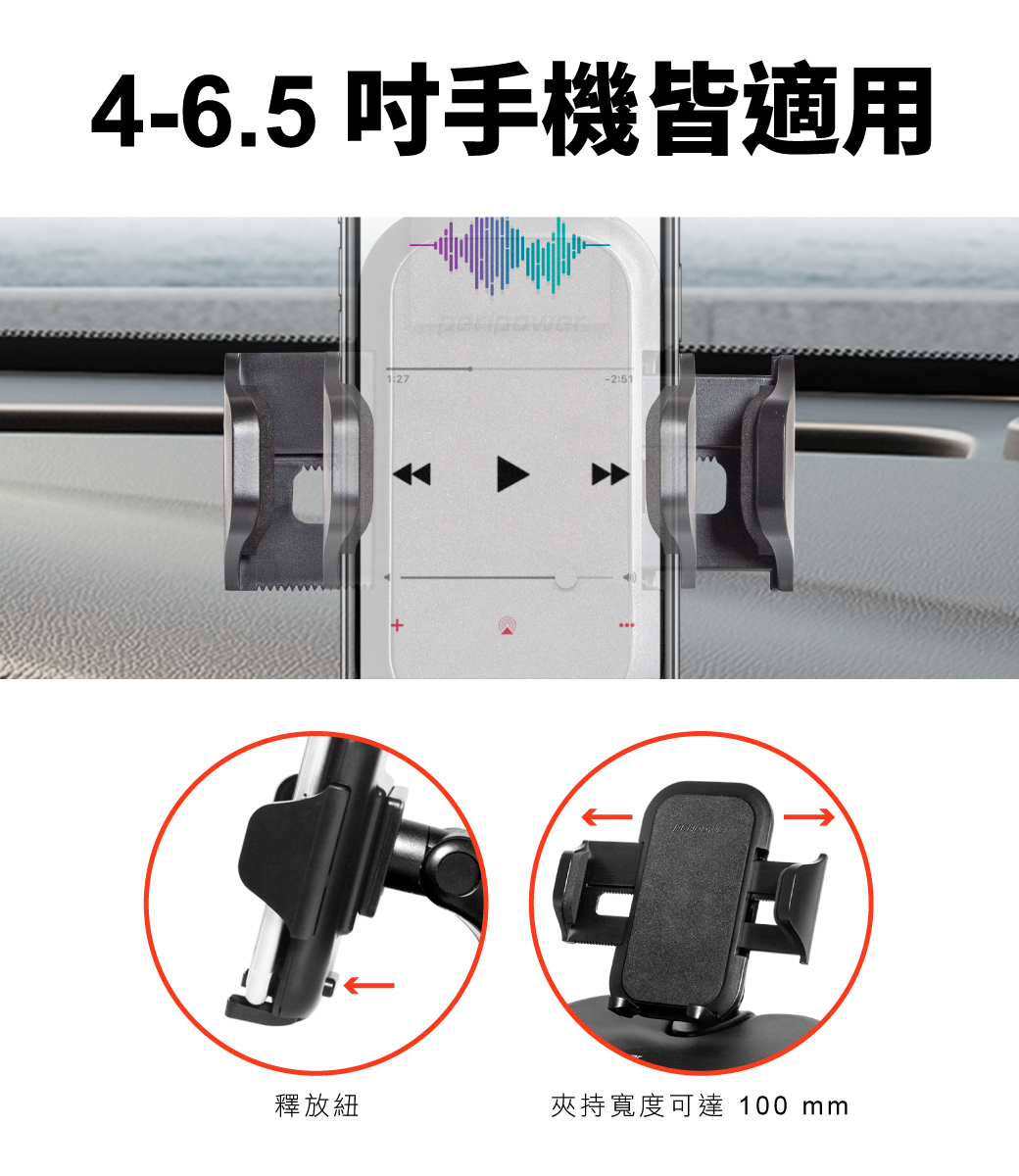 .4-6.7 吋手機皆適用,夾持範圍可達 100 mm
