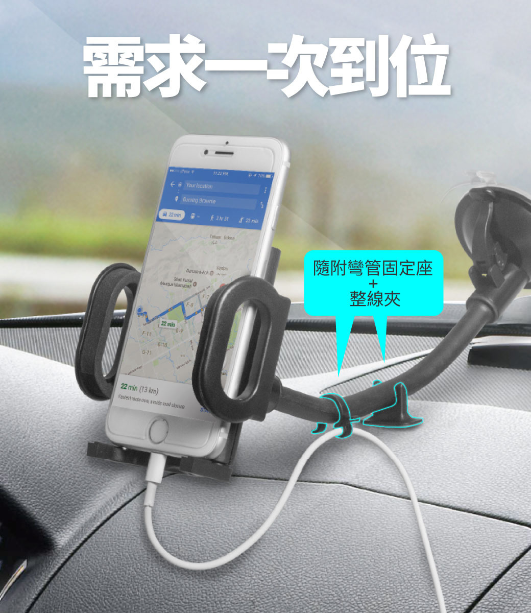 內容物:可彎鋁管支架 x 1、手機夾具 x 1、彎管固定座 x 1、整線夾 x 1