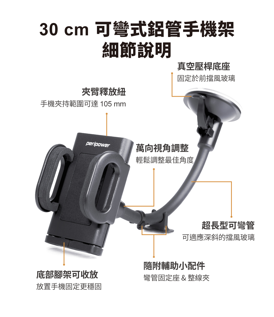 產品尺寸:(手機夾具:70 x 100 x 45 mm、彎管支架:68 x 78 x 275 mm)