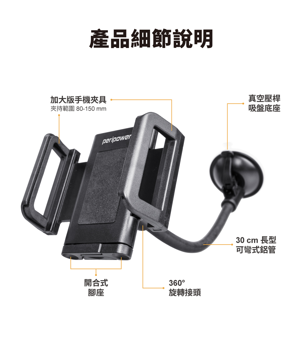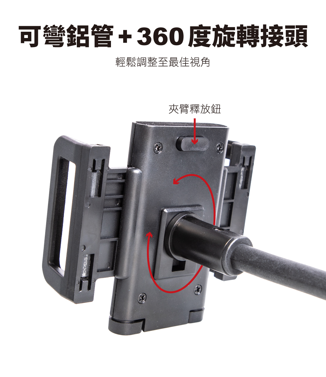 長型可彎鋁管 + 360 度旋轉接頭,輕鬆調整至最佳視角