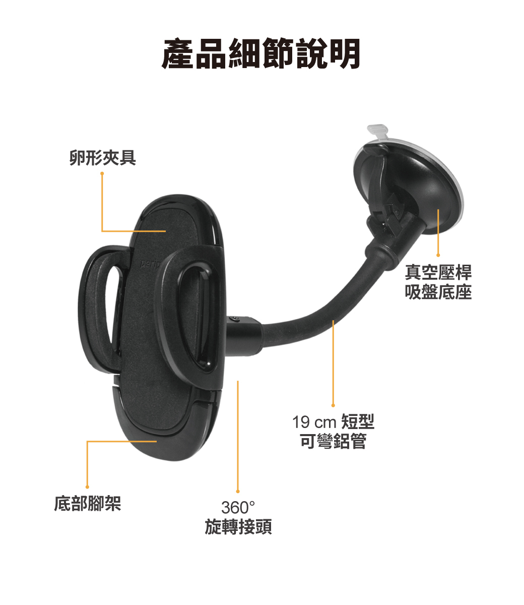 產品尺寸:(手機夾具:116 x 70 x 40 mm、彎管支架:68 x 78 x 200 mm)
