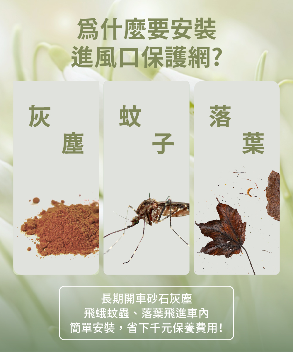 .此產品可用於保護進風口,可防止落葉蚊蟲掉入進風口。