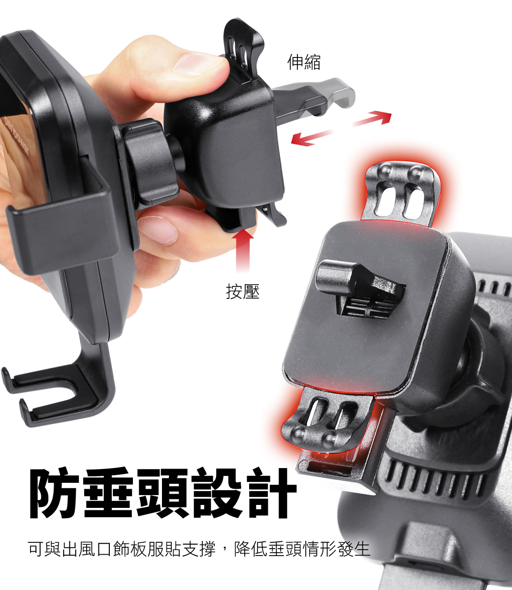 .支架端彈力伸縮倒鉤設計, 操作省力,單手按壓即可安裝