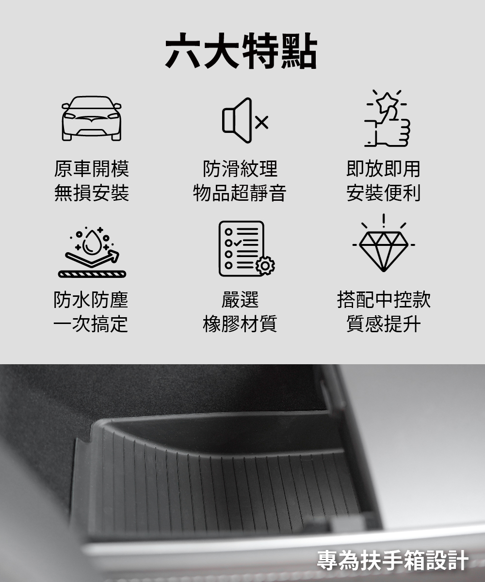 .安裝簡易,直接放置於扶手箱即可使用。