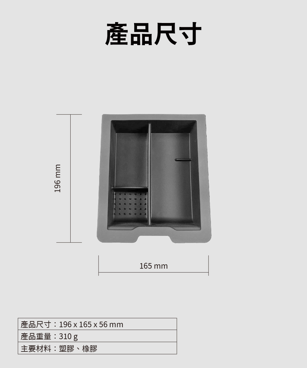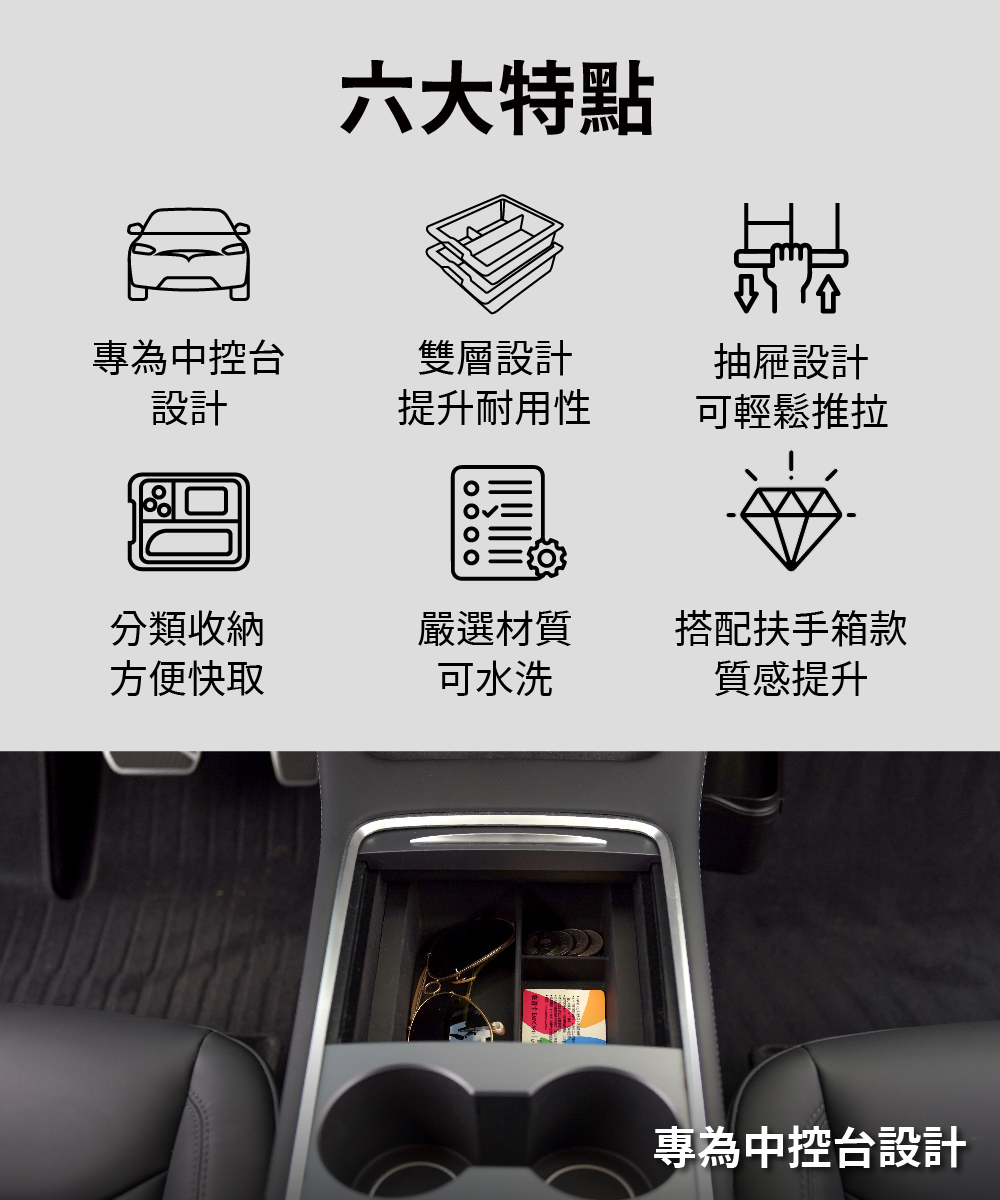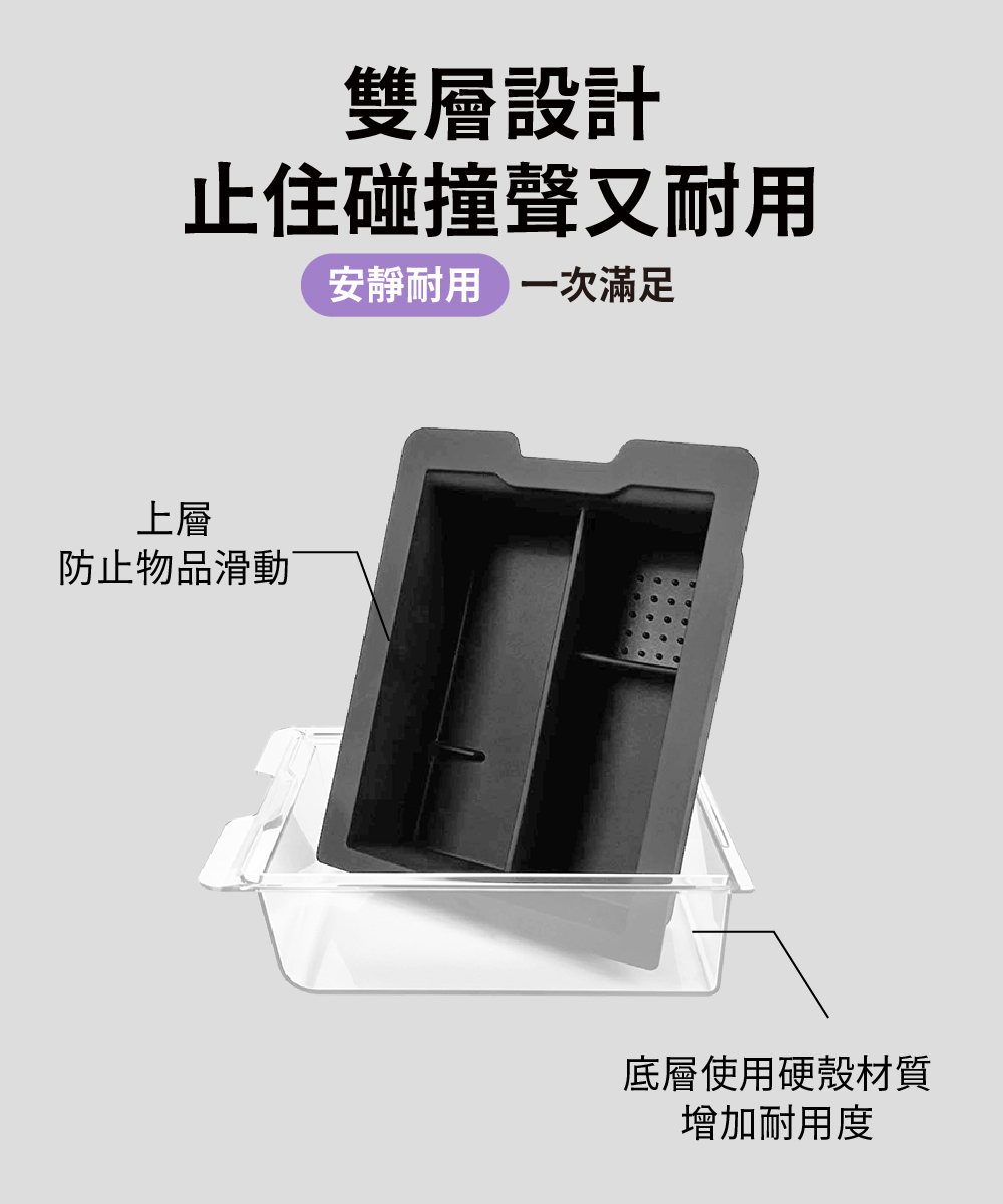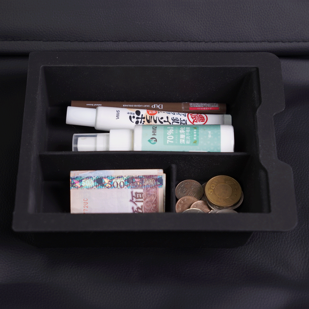 .專為中控台設計的收納盒,用於區分上、下層的物品收納。